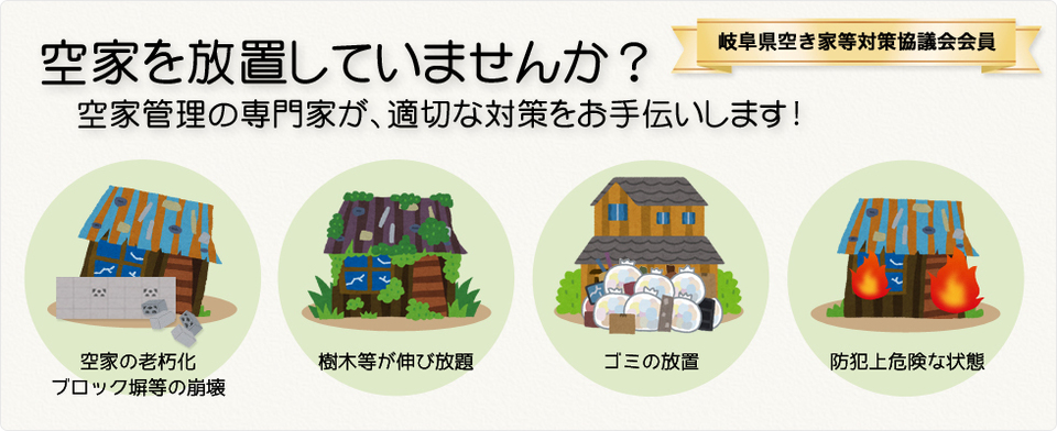 そこで、岐阜県空き家管理業協会では、空き家の管理状況をチェックし、適正な管理や有効活用方法をご提案いたします。